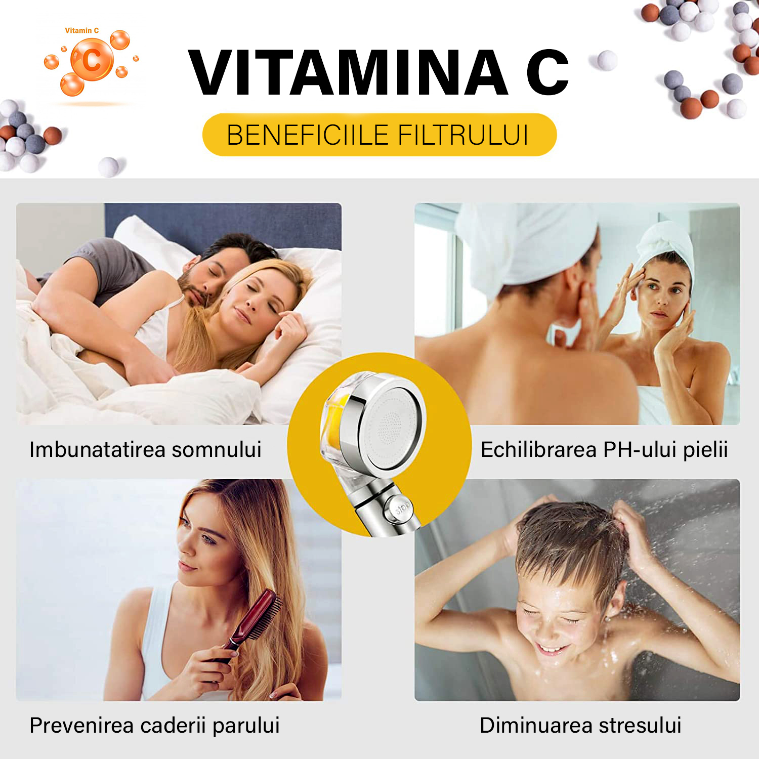 Cu introducerea vitaminei C in experienta noastra de dus, beneficiile devin cu adevarat remarcabile. Cunoscuta pentru proprietatile sale antioxidante si revitalizante, vitamina C nu numai ca hraneste pielea si parul, ci si ajuta la combaterea stresului oxidativ si la intarirea sistemului imunitar. Astfel, fiecare stergatura sub jetul de apa devine o ocazie de a ne incarca organismul cu energie si vitalitate.